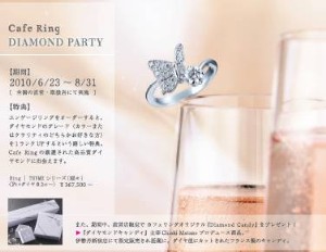 「Cafe Ring 銀座本店」「Cafe Ring 銀座並木通り店」「Cafe Ring 横浜みなとみらい店」「Cafe Ring 心斎橋店」の直営店舗を中心に、北海道から沖縄までの契約店83店舗でファッションジュエリー、ブライダルジュエリーを販売する『Cafe Ring(カフェリング)』が、2010年6月23日~8月31日まで、直営・全国取扱店でブライダルフェア「Diamond Party(ダイヤモンドパーティ)」を開催する。
