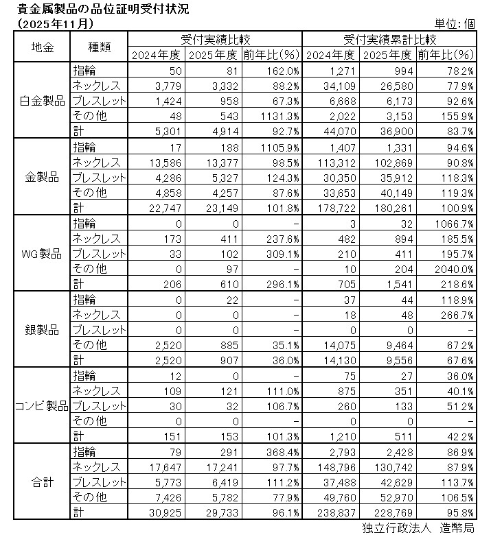 2025年11月の貴金属製品の品位証明受付状況