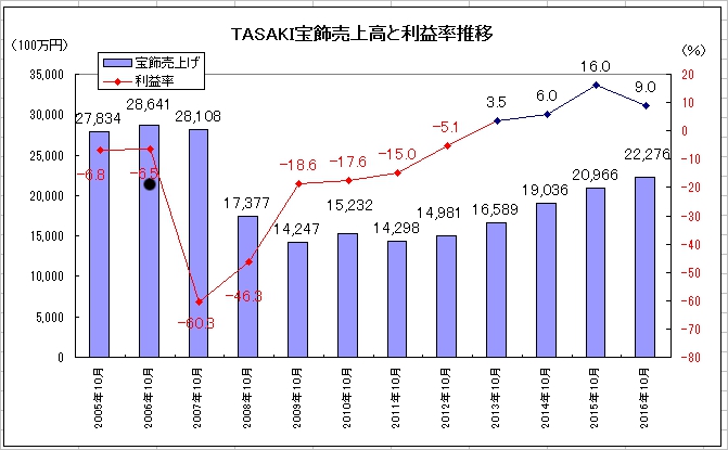 TASAKIの前身である田崎真珠は、1956年に田崎俊作氏によって創業され、国内真珠最大手に育ち、1993年に東証1部に上場。1994年に日本で唯一のデビアスのサイトホルダーとなった。だが2000年代に赤字に転落し、膨大な在庫を抱えて株価も低迷していた。