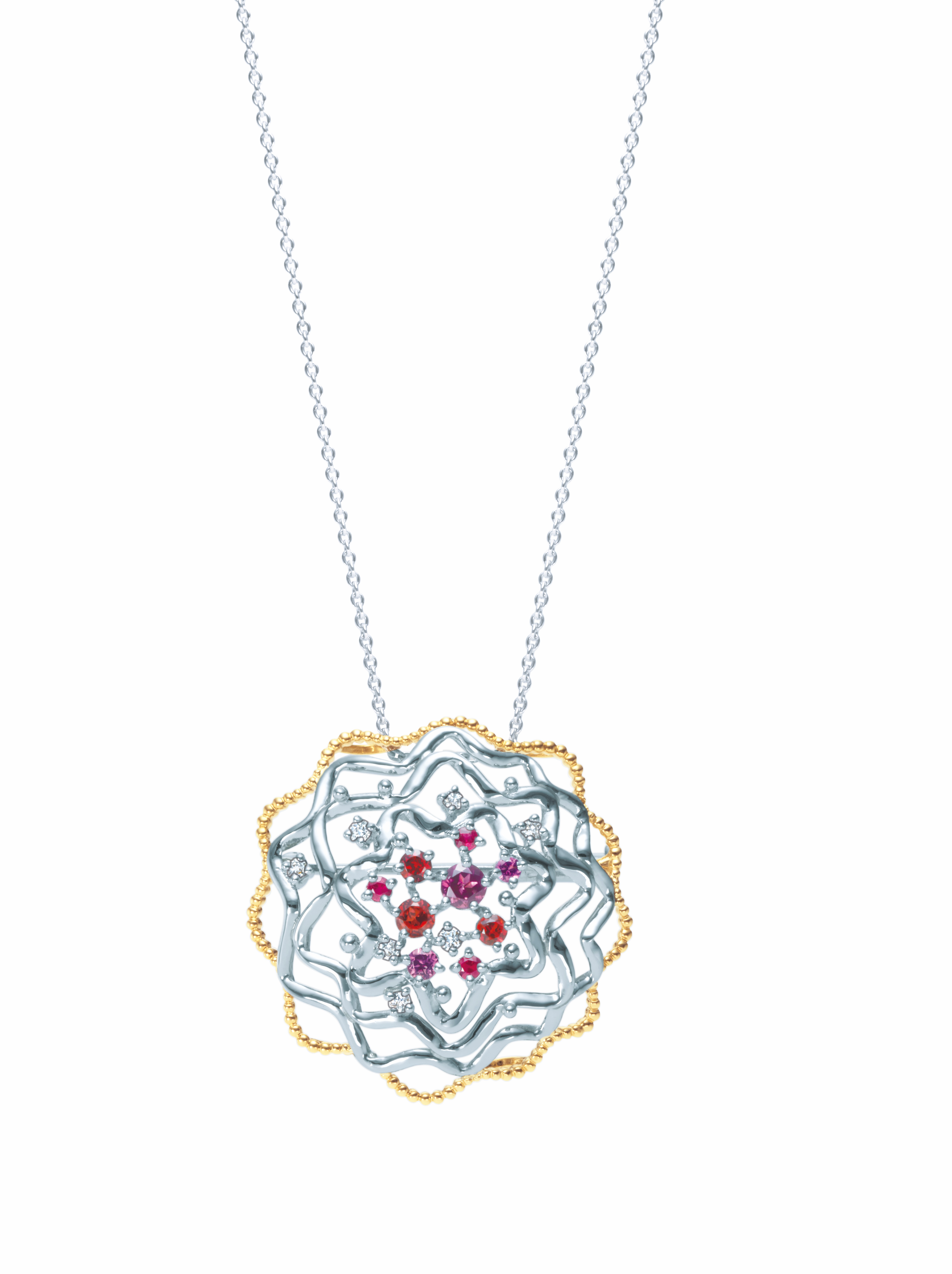 ■【FLOWER (フラワー)】繊細な花びらが幾重にも重なり、大輪の花が咲き誇るような華やかさとエレガンスを纏ったジュエリー。花芯を模したガーネット、ルビー、ダイヤモンドが鮮やかな彩りを添え、身にまとう女性を主役として際立たせるコレクションである。