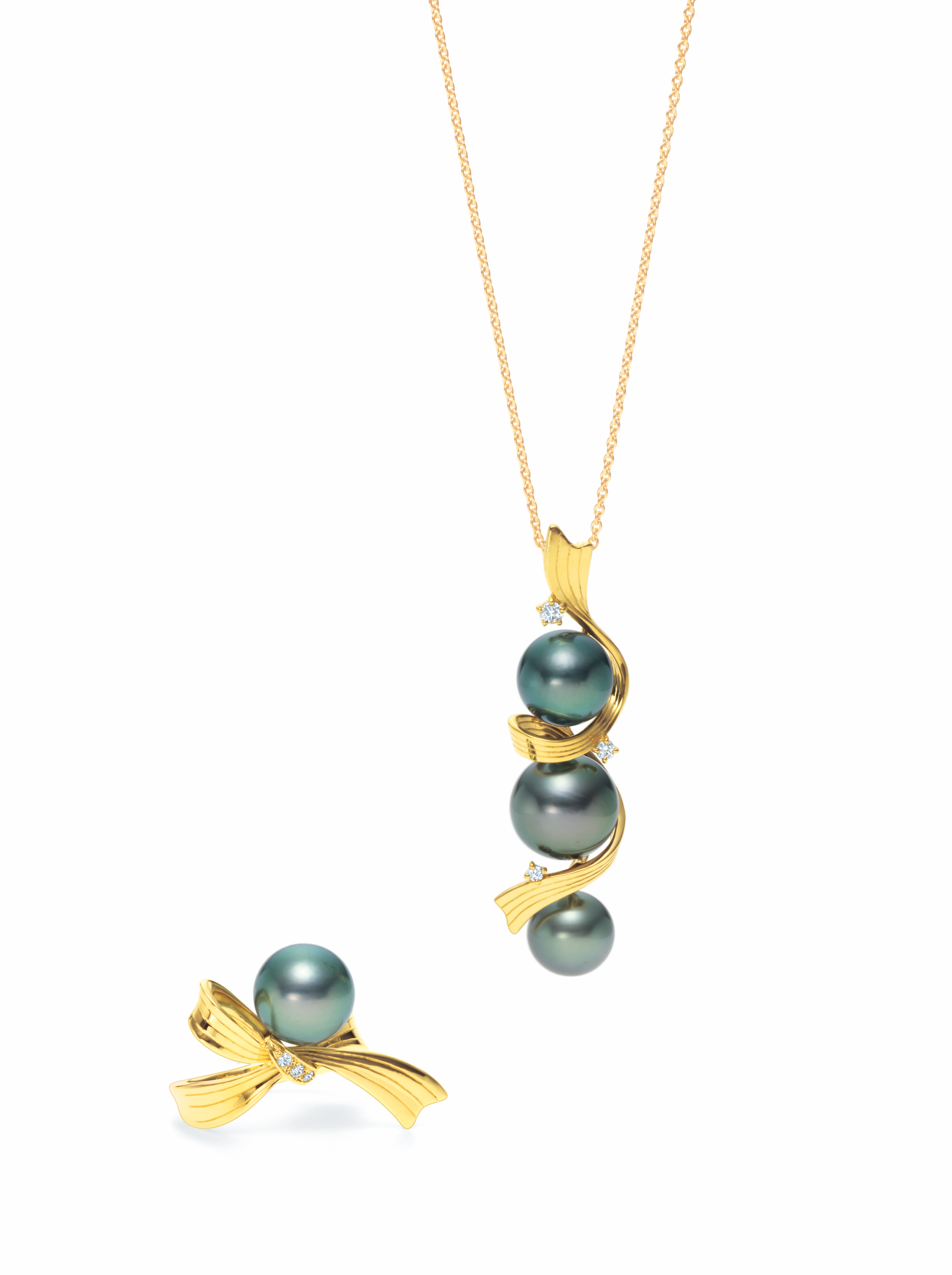 ■【BOW(ボウ)】深みのあるトーンを湛えた黒蝶真珠に、可憐な印象を添えるストライプ模様のリボンが優美に絡み合う。大人の品格と個性を兼ね備えたパールジュエリーであり、ナチュラルな色彩の奥深さと存在感のある美しさが、装いに華やぎと気品をもたらしている。